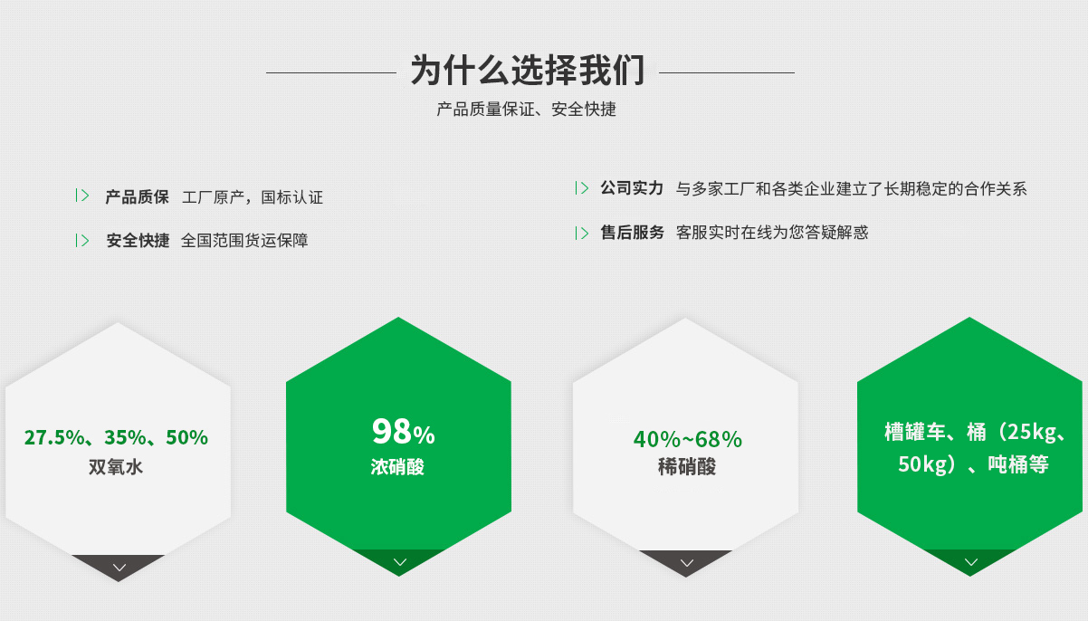 安徽安德諾化工產品銷售有限公司:位于合肥市蜀山區,交通便利,主要經營雙氧水(27.5%、35%、50%)、濃硝酸(98%)、稀硝酸(40%~68%)等化工產品,與多家工廠和各類企業建立了長期穩定的合作關系。公司產品齊全,實力雄厚,重信用、守...